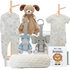 Welcome the new bundle of joy with our Pure Baby Snuggles Hamper. This delightful baby hamper makes the perfect gift of gorgeous baby items including 2 essential growsuits, a cute, cuddly comforter, a soft bassinet blanket and a baby book. Such a beautiful new baby gift the new parents will love.