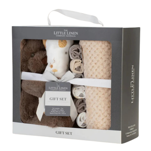 This Little Linen Company Boxed Gift Set - Nectar Bear, combines key items to have on hand for any newborn baby. This set features a soft and functional plush blanket, a cuddly plush toy, 6x knitted terry washers, and an incredibly useful muslin wrap.