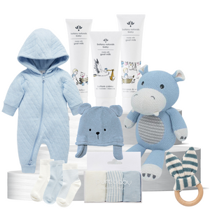 For a Little Gentleman This is a snuggly baby hamper for your little baby boy. Harry the Hippo brings cute, cuddly playtime, while the stripey grow suit keeps him comfy. Tiny...