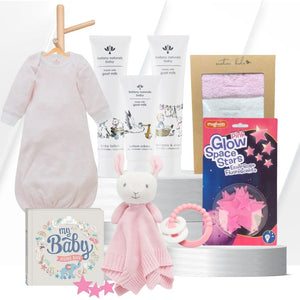 Say ‘Hello’ to the little princess with our delightful baby girl hamper, perfect for a baby shower. Inside, we’ve packed soft comforts – a pink mélange stripe sleep suit, a knitted bunny comforter, and a pink Winiteether. Pamper the little girl with Botany Naturals baby lotion and shampoo, and gentle face washers with a heart and teddy design. Add a touch of magic with glow-in-the-dark stars and Baby's First Bedtime Book. This beautifully packed baby gift collection offers a gentle, loving start for the new arrival.