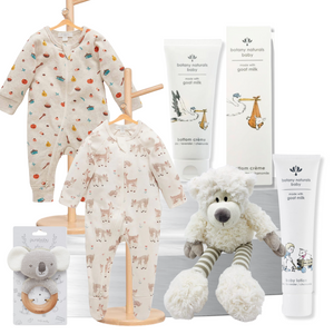 Congratulations! We've put together a lovely playtime baby hamper to welcome your little one. Snuggle them in the soft Pure Baby zip grow suits, featuring adorable fawn and veg soup prints. The koala rattle and plush teddy offer gentle comfort and play. For bub's delicate skin, we've included Botany Naturals baby bottom cream and lotion, both made with natural ingredients. We hope this baby gift selection brings comfort and joy to both you and your precious baby. Enjoy these special early days!