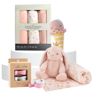 This baby girls’ playtime essentials hamper was designed to bring joy to your little one and ease to your days. Let her snuggle up with Anne Hopaway Bunny and her soft blanket, while the ballerina bunny muslin wraps offer gentle comfort. Isla Icecream rattle provides sweet sensory play, and the pram clips keep toys secure on your adventures. We are sure these thoughtfully chosen goodies will bring smiles and happy moments to your darling baby girl.