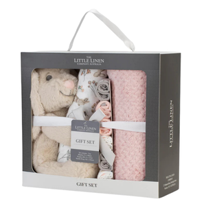 This Little Linen Company Boxed Gift Set - Harvest Bunny, combines key items to have on hand for any newborn baby. This set features a soft and functional plush blanket, a cuddly plush toy, 6x knitted terry washers, and an incredibly useful muslin wrap.