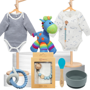 This charming mealtime baby hamper was packed with a special new baby boy in mind. Featuring soft, blue-themed essentials like a Pure Baby bodysuit and Gerry Giraffe toy, alongside practical items such as a Tiny Dining bamboo spoon and suction bowl, it's both adorable and useful. The Winibeads dummy chain and teether complete this warm, blue-hued ensemble, giving you a sneak-peak into a delightful start to baby’s mealtime adventures.