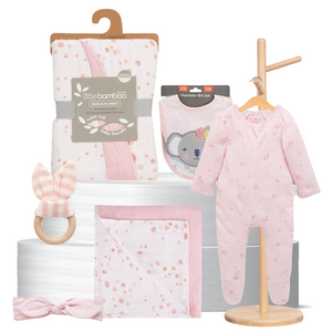 Delight the parents-to-be of a baby girl with this beautifully packed mealtime baby hamper. We've gathered soft, essential items in gentle pink tones. The Dusty Pink Little Bamboo muslin blanket offers cosy comfort, while the Pure Baby rose rabbit ear teether soothes delicate gums. The charming Kimmy Koala Weegoamigo bibs add a playful touch to feeding times. Completing the set is the adorable Pure Baby zip growsuit and headband set, giving baby both comfort and style. This thoughtful baby gift collection makes a perfect, practical, and charming gift for new parents.