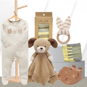 In many ways, this is a perfect baby birthday hamper! This gorgeous collection is all about comfort and style for your little one. It features a cosy Knitted Dog Comforter for warm snuggles, along with an adorable Bear Growsuit that’s both practical and super cute. Ideal for welcoming a new arrival, this hamper blends elegance with comfort, making it a thoughtful gift that’ll be loved and appreciated. It’s the perfect way to spoil bubs and their family with something special!