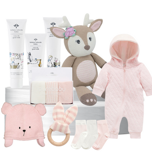 Put together with care, this gorgeous baby birthday hamper features the Pure Baby Winter Collection Blush Growsuit (Size 000), adorable Beetroot Pom Pom Booties, and a cuddly Pink Teddy Bear. Keep her cosy with the Pure Baby Fawn Beanie and soothe teething with the Rabbit Ear Teether.
