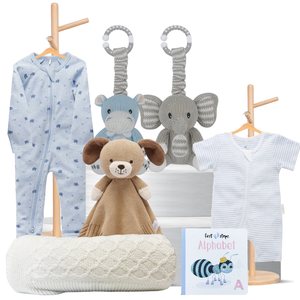 Welcome the new little prince with our Pure Baby Boy Snuggles Hamper. This delightful baby boy hamper makes the perfect gift of gorgeous baby items including 2 essential growsuits, a cute, cuddly comforter, a soft bassinet blanket and a baby book. Such a beautiful new baby gift the new parents will love.