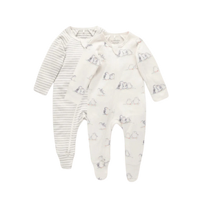 Pure Baby's best-selling Zip Growsuit, featuring a limited edition gorgeously illustrated print and a second striped growsuit. A baby wardrobe staple, these growsuits are designed for day-to-night wear. Made from the softest certified 100% Organic Cotton for a soft and gentle touch against your baby's delicate skin. Your newborn will be kept covered and warm with long sleeves, inbuilt feet, and optional turn-over mittens.