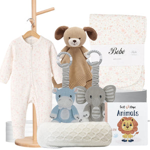 Welcome the new bundle of joy with our Pure Baby Snuggles Hamper. This delightful baby hamper makes the perfect gift of gorgeous baby items including an essential growsuit, a cute, cuddly comforter, a soft bassinet blanket and a baby book. Such a beautiful new baby gift the new parents will love.