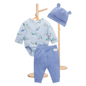 Pure Baby's 3-piece gift set is beautifully designed for great gift ideas. This comes with a long sleeve printed bodysuit, legging-style pants and a matching hat with cute ears on top.