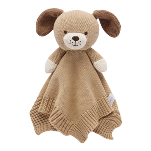 This sweet knitted dog security blanket is the perfect mate for any newborn. Soft cotton knit makes it gentle and easy for tiny hands to cuddle all day. Perfectly cosy and comforting, it’s made from 100% cotton with a 100% recycled polyester filling for extra care.
